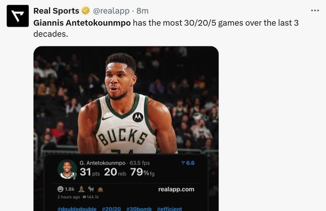 也讓字母哥成為過去30年拿到至少30分20籃板5助攻數(shù)據(jù)次數(shù)最多的球員。