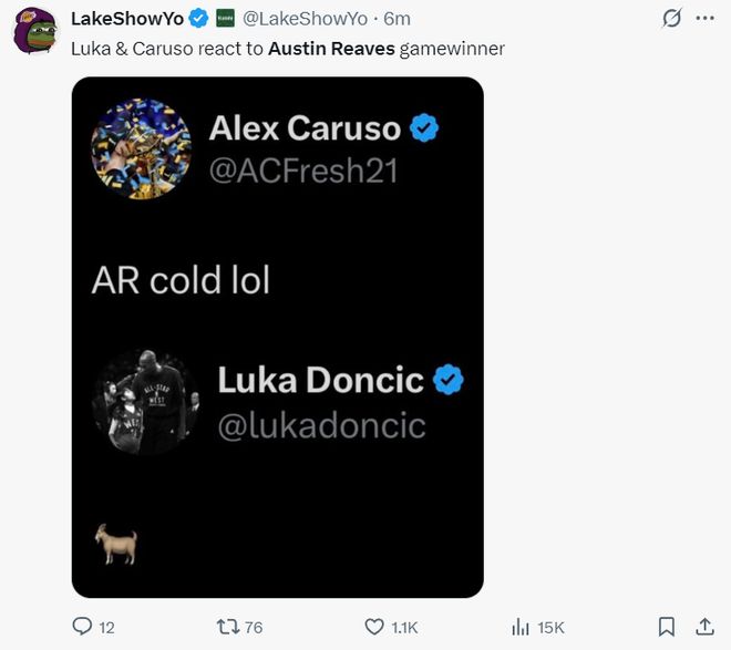 卡魯索與東契奇都在IG上對里夫斯的表現做出了評價,東契奇又來一次GOAT。