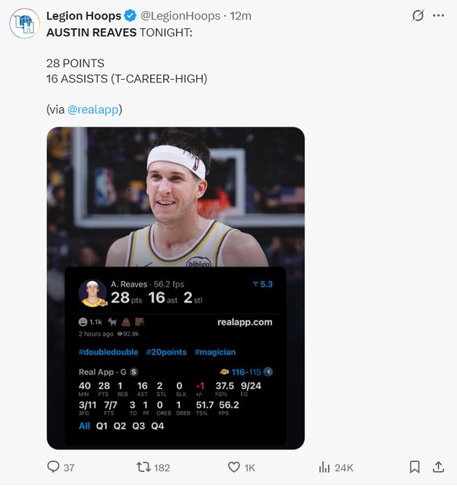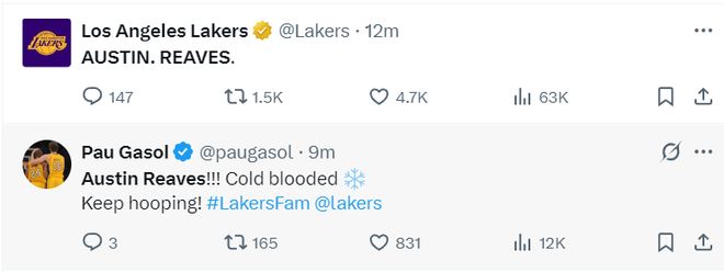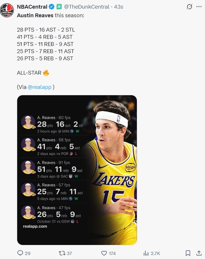 湖人官方發了一個奧斯汀-里夫斯的名字。
