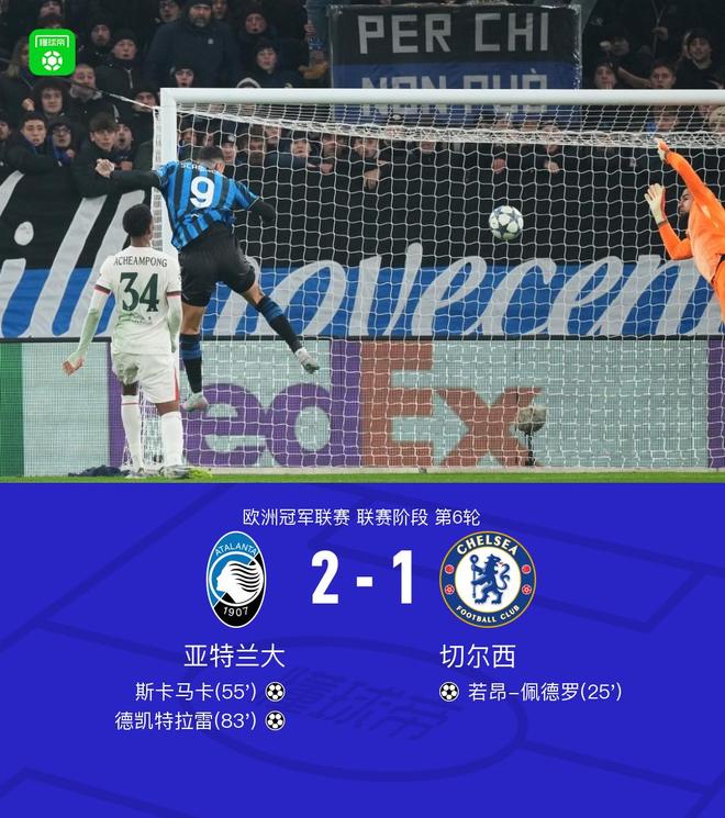 北京時間12月10日,歐洲冠軍聯賽聯賽階段第6輪展開較量,亞特蘭大與切爾西狹路相逢。比賽伊始,切爾西率先打破僵局,若昂-佩德羅接里斯-詹姆斯助攻后完成破門,為球隊取得領先。隨后亞特蘭大展開反擊,德凱特拉雷送出精準傳球,斯卡馬卡抓住機會頭球破門扳平比分。下半場尾聲階段,亞特蘭大持續施壓,德容恩送出關鍵一傳,德凱特拉雷冷靜施射得手,幫助球隊實現反超。最終全場比賽結束,亞特蘭大以2比1戰勝切爾西。