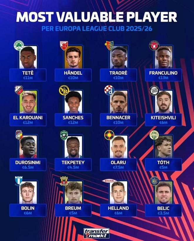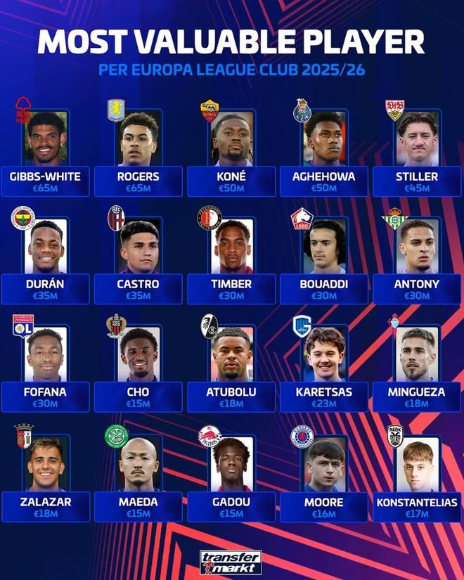 北京時間10月24日,德轉列出了本賽季歐聯杯36支參賽球隊各自身價最高的球員,諾丁漢森林的吉布斯-懷特和阿斯頓維拉的摩根-羅杰斯以6500萬歐元并列第一,目前效力于皇家貝蒂斯的安東尼上榜。
